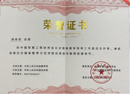 3月25日,学院经中国智慧工程研究会安全健康教育指导工作委员会评审,荣获全国安全教育优秀示范学院荣誉,杨依依老师获评优秀指导老师。