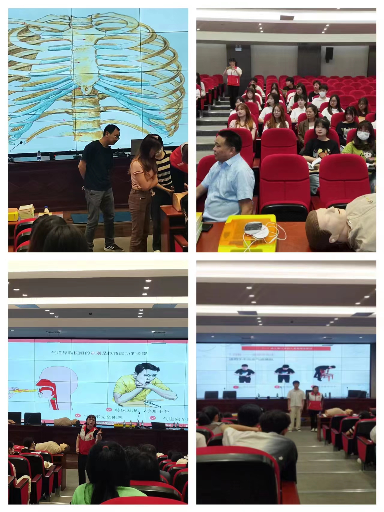 红十字会老师详细讲解了相关知识,并“手把手”为大家演示了创伤救护、心肺复苏术和气道异物急救的具体操作,仔细讲解要点、细节、注意事项等,使参加培训的同学们真正了解、掌握这些突发紧急情况下救命的“绝技”。