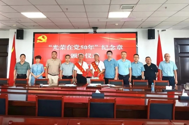 颁发仪式上,党委书记曾传鸿为舒根茂、金荣堂两位退休老同志颁发“光荣在党50年”纪念章,并向他们表示热烈祝贺和崇高敬意。