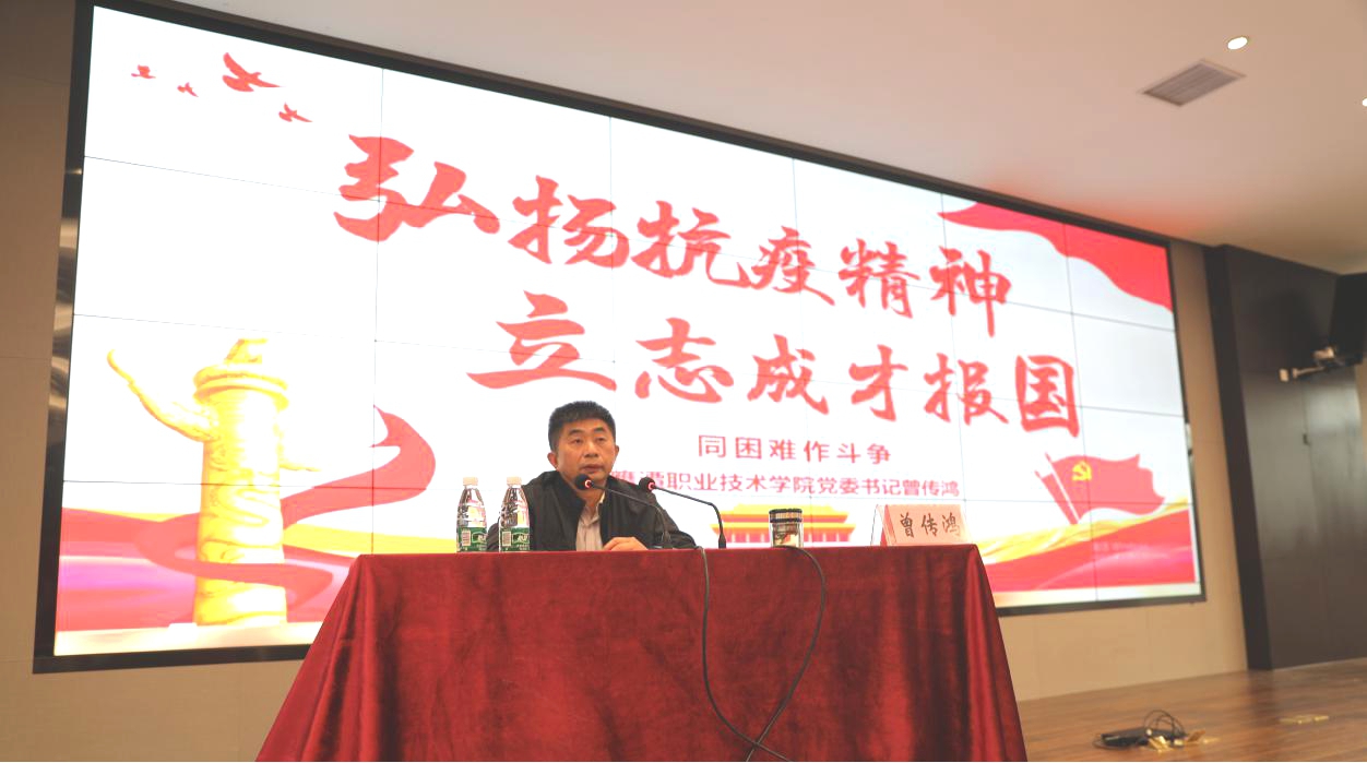 为贯彻习近平总书记关于教育的重要论述精神,用伟大抗疫精神深入开展爱国主义教育,10月21日下午,学院党委书记曾传鸿在教学楼报告厅为2020级新生讲授《弘扬抗疫精神立志成才报国》思政大课。学院党委副书记俞万华主持会议,全体班主任和学生代表300余人到场聆听。